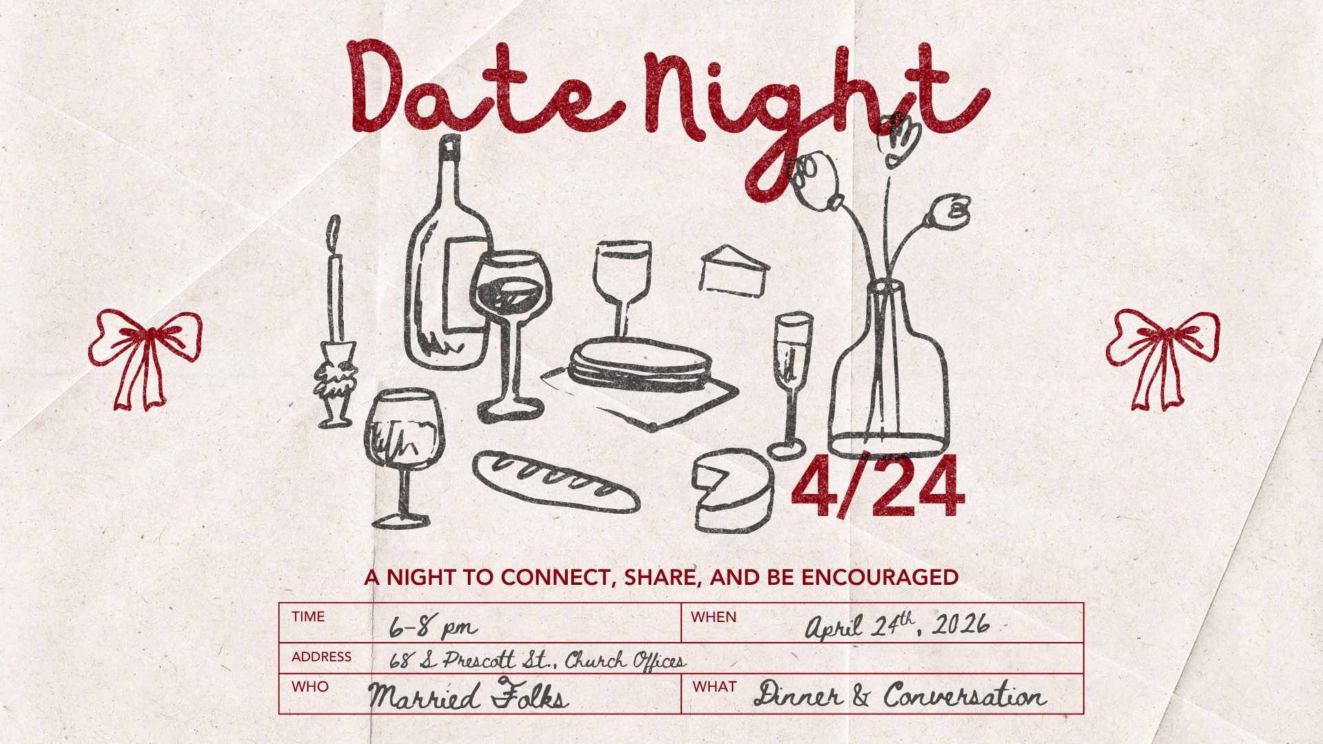 Join us for a casual night around the table with other married couples. We’ll share a great meal, laugh a little, and have real conversations about the highs, the challenges, and everything in between when it comes to marriage.